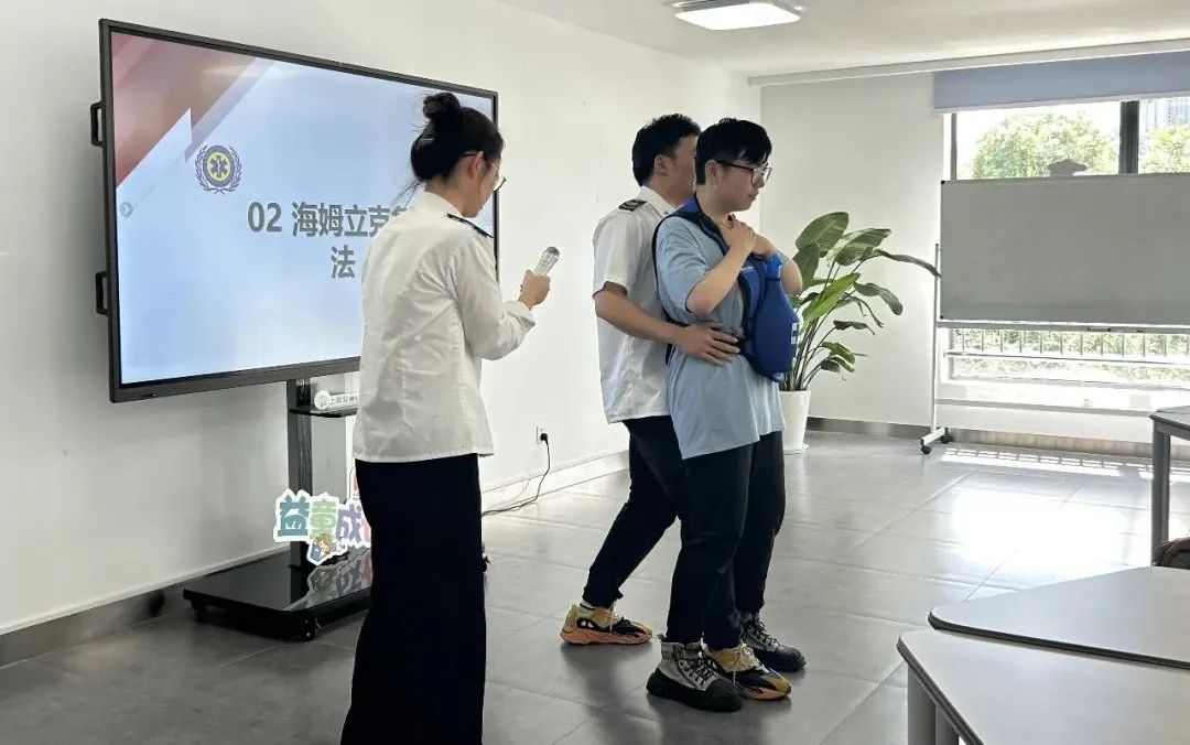 “海姆立克急救法是一种用于气道异物梗阻的现场急救法。如果食物卡在喉咙,导致呼吸困难,可以采用海姆立克急救法将异物排出。”现场,嘉定区医疗急救中心急救医生姚宇艳教授孩子们正确掌握海姆立克急救法。