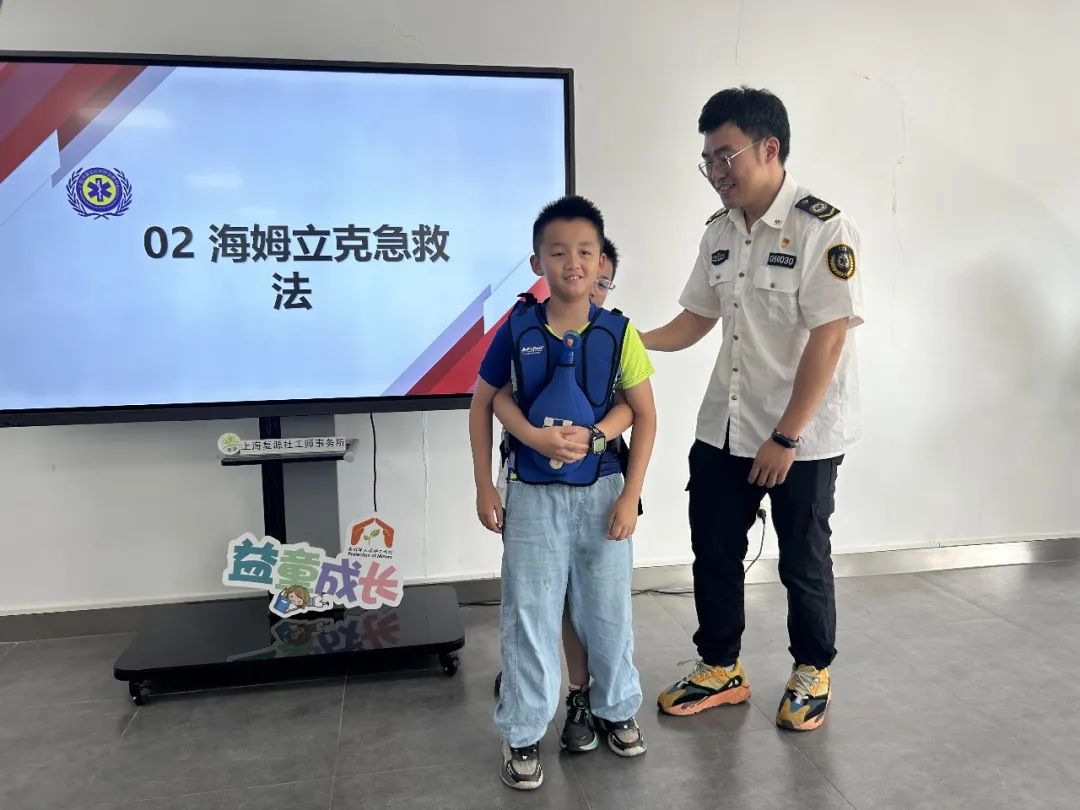 “如果不慎落水,一定要保持冷静,不要在水中挣扎,要用双手抱住膝盖,让身体保持蜷缩,采用水母漂的方式,身体就会慢慢浮出水面。”现场,来自宝山区普莱德青年应急救援服务中心的老师为大家讲解溺水后的自救。