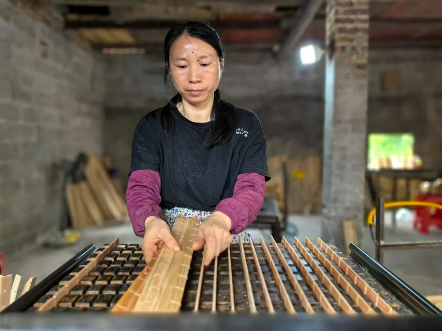 方格簇加工坊负责人廖诗缘说:“我们这个方格簇一个月的产量大概是5000个左右,一个是18元,一年的利润大概是25万元,除了销往黄冕本地以外,还销往鹿寨镇、寨沙镇以及桂林的永福和临桂等地。”