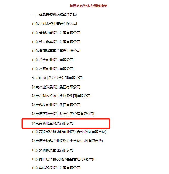 7月2日,首届“齐鲁资本力量榜”公布,济高财金公司与省财金资本、省新动能投资、铁发资本等17家投资机构,成功入围“优秀投资机构榜单”,充分展现了公司近年来的投资成绩与风采。
