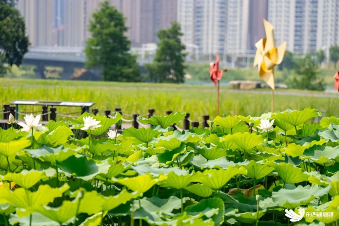 公园西北方向,有400余平方米的荷花池塘。站在观景台,远远望去,荷花池与武汉轨道交通1号线同框。