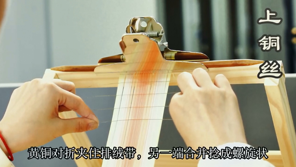 3.上铜丝:黄铜对折夹住排绒带,另一端合并捻成螺旋状。