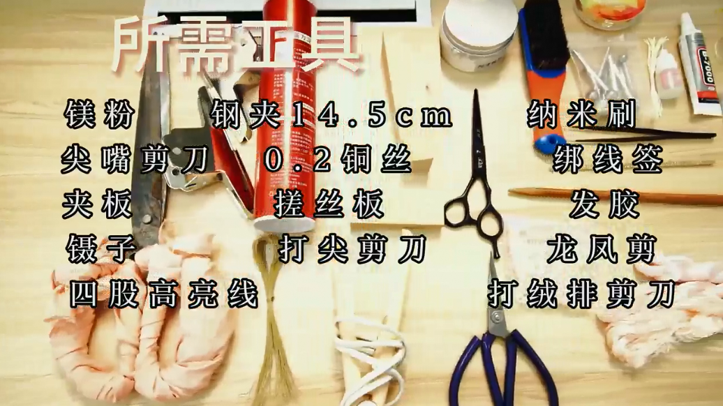 所需工具:镁粉、钢夹14.5厘米、纳米刷、尖嘴剪刀、0.2铜丝、绑线签、夹板、搓丝板、发胶、镊子、打尖剪刀、龙凤剪、四股高亮线、打绒排剪刀
