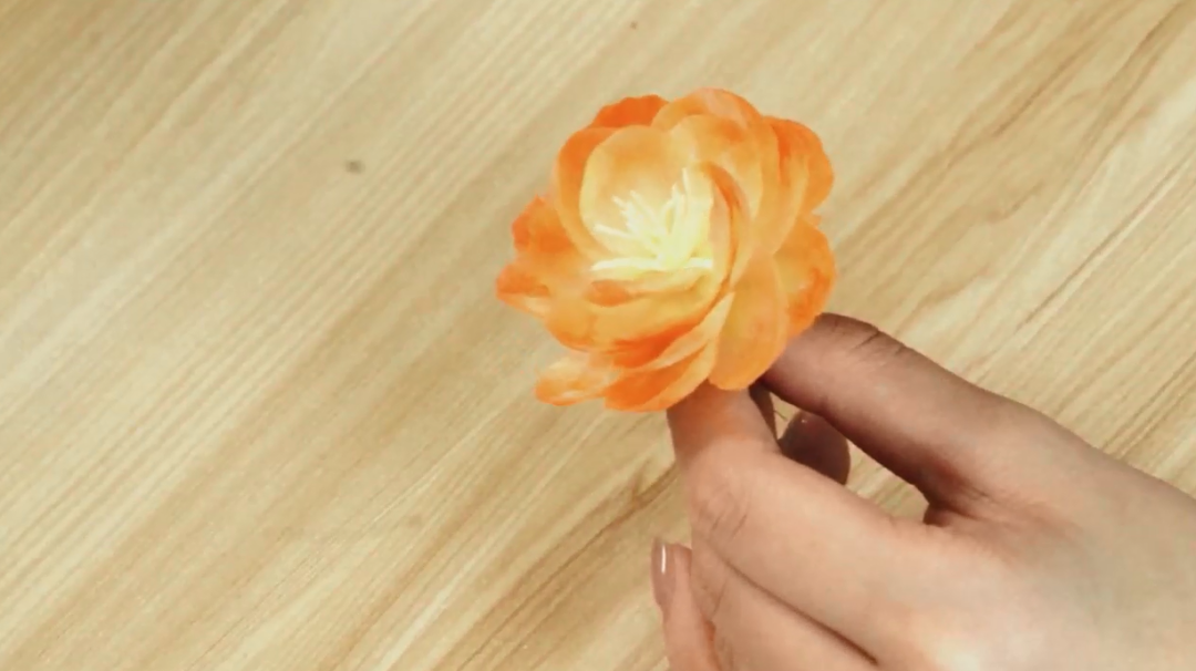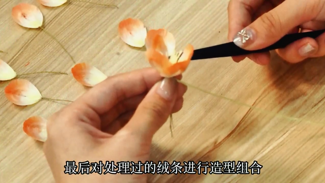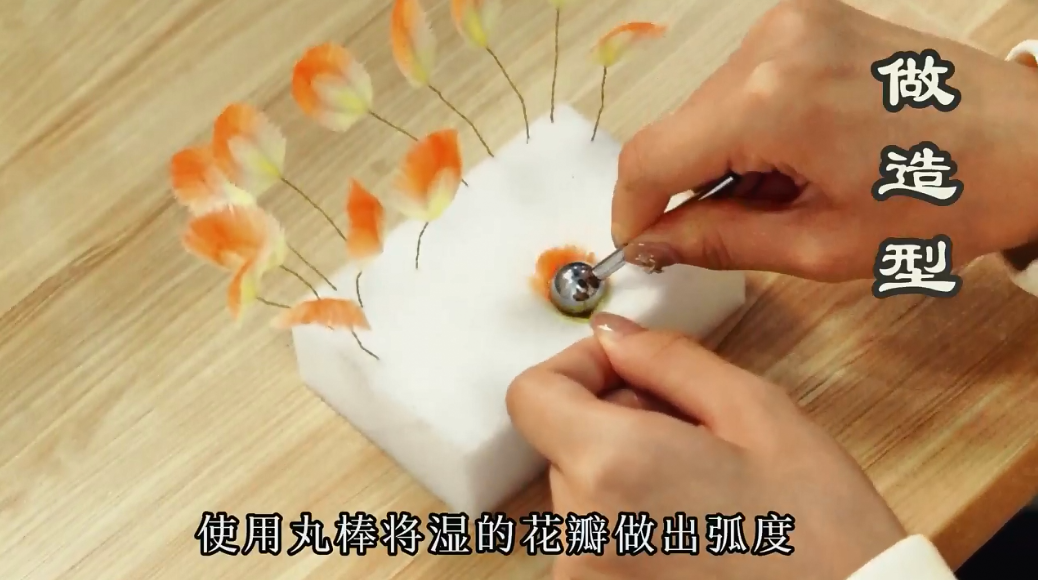 7.做造型:使用丸棒将湿的花瓣做出弧度。