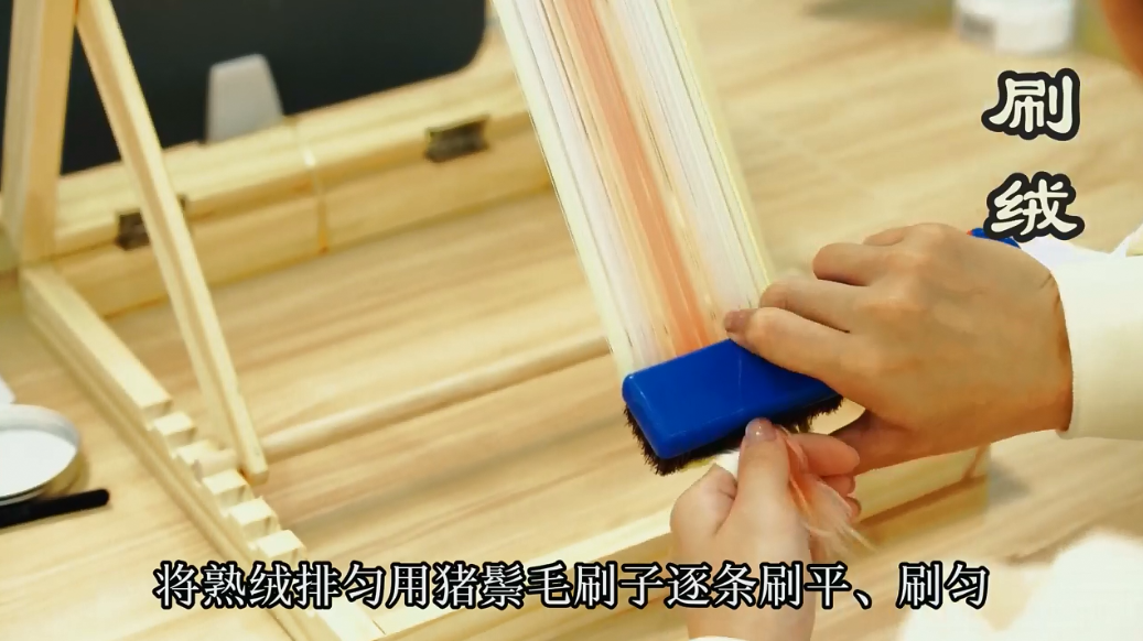 2.刷绒:将熟绒排匀,用猪鬃毛刷子逐条刷平、刷匀。