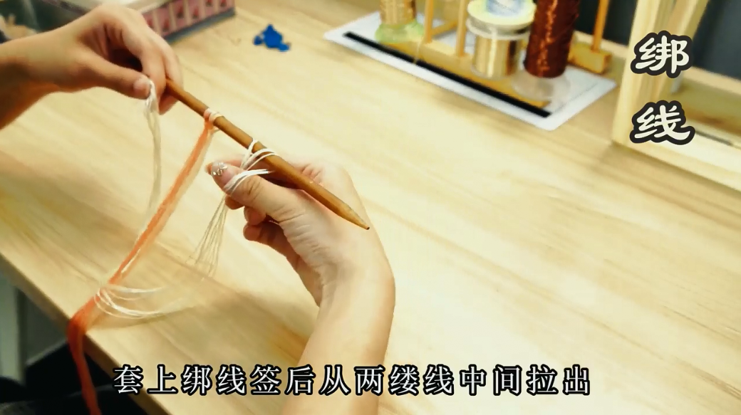 1.绑线:套上绑线签后从两缕线中间拉出,进行颜色排列。