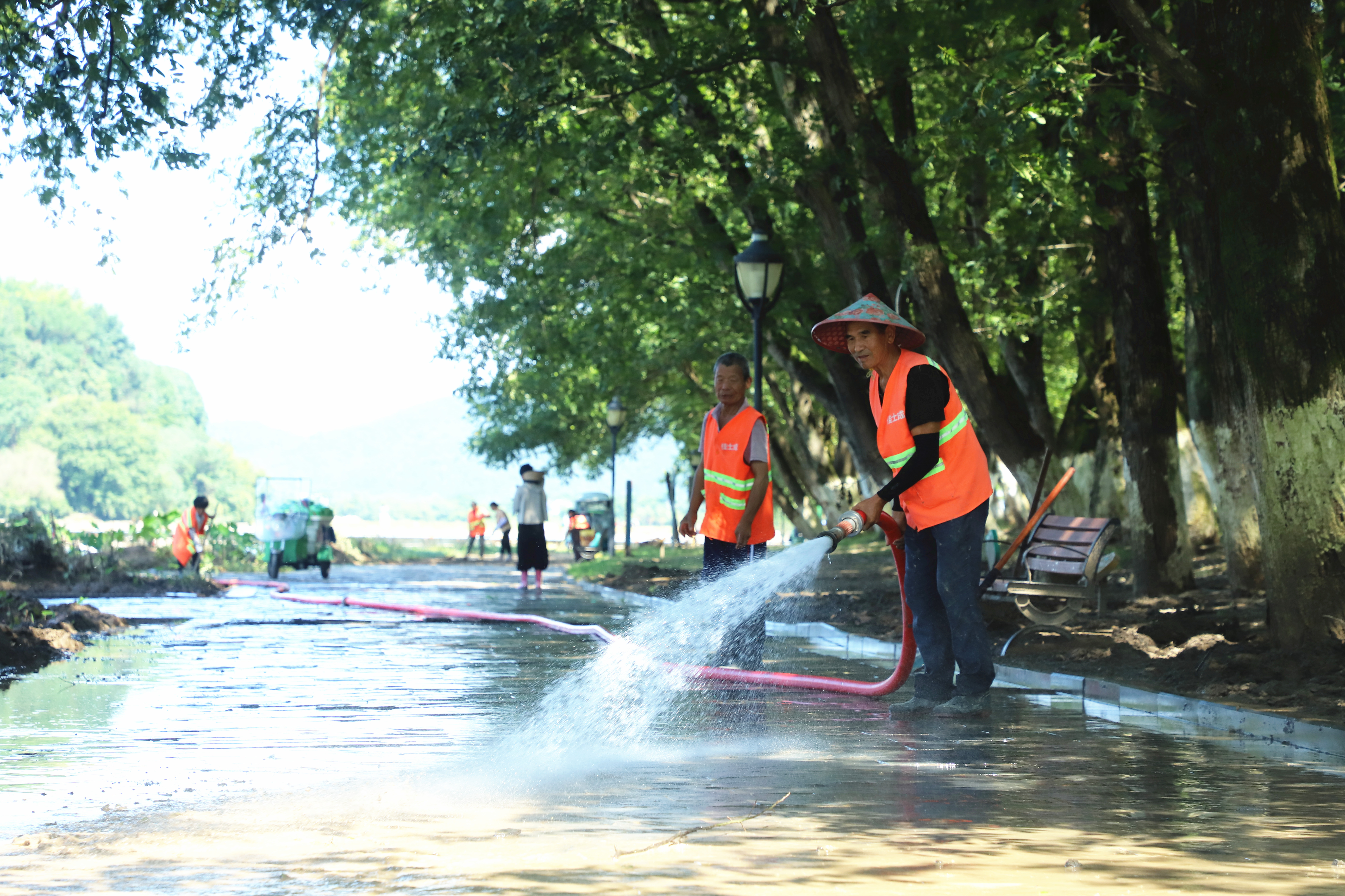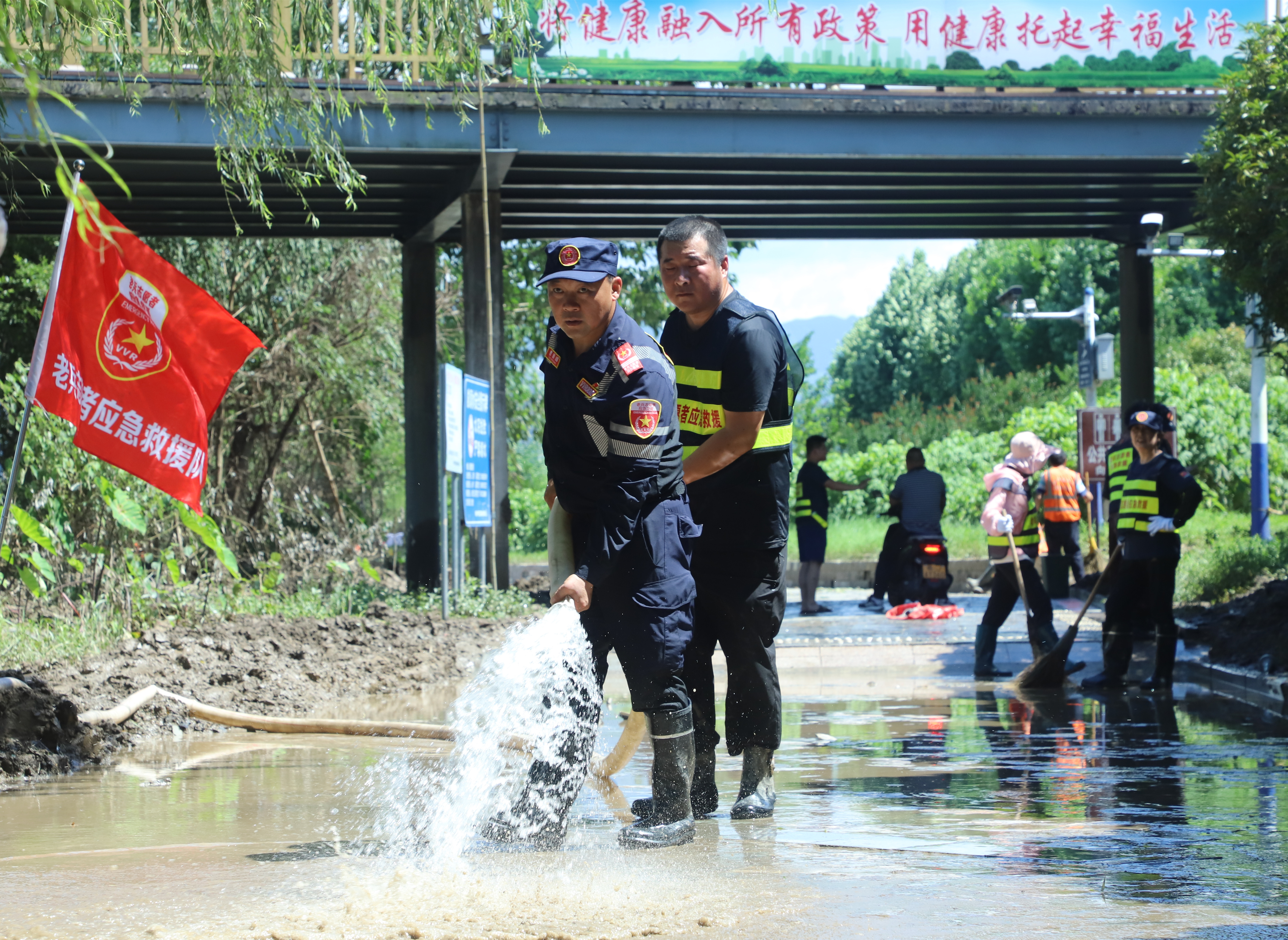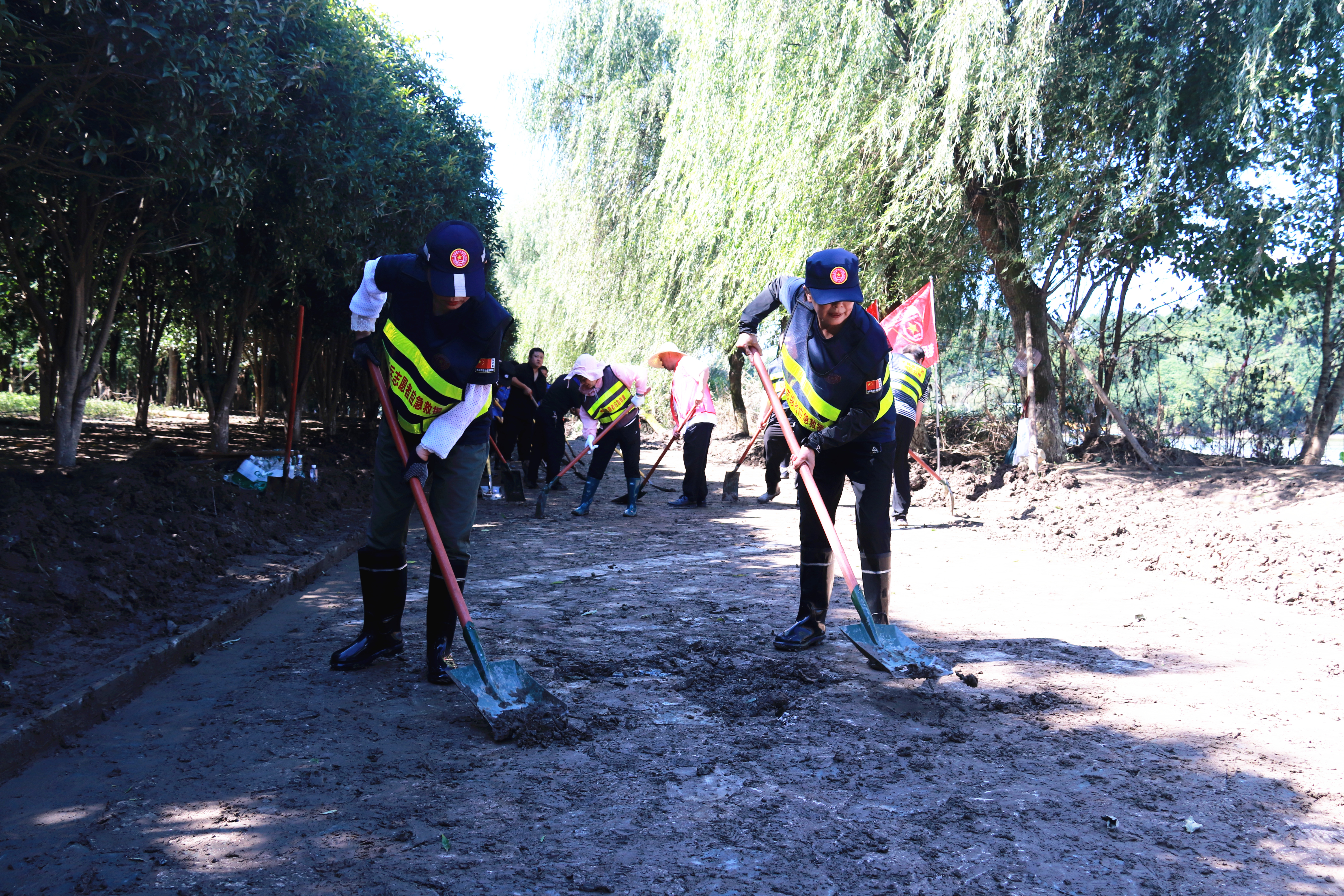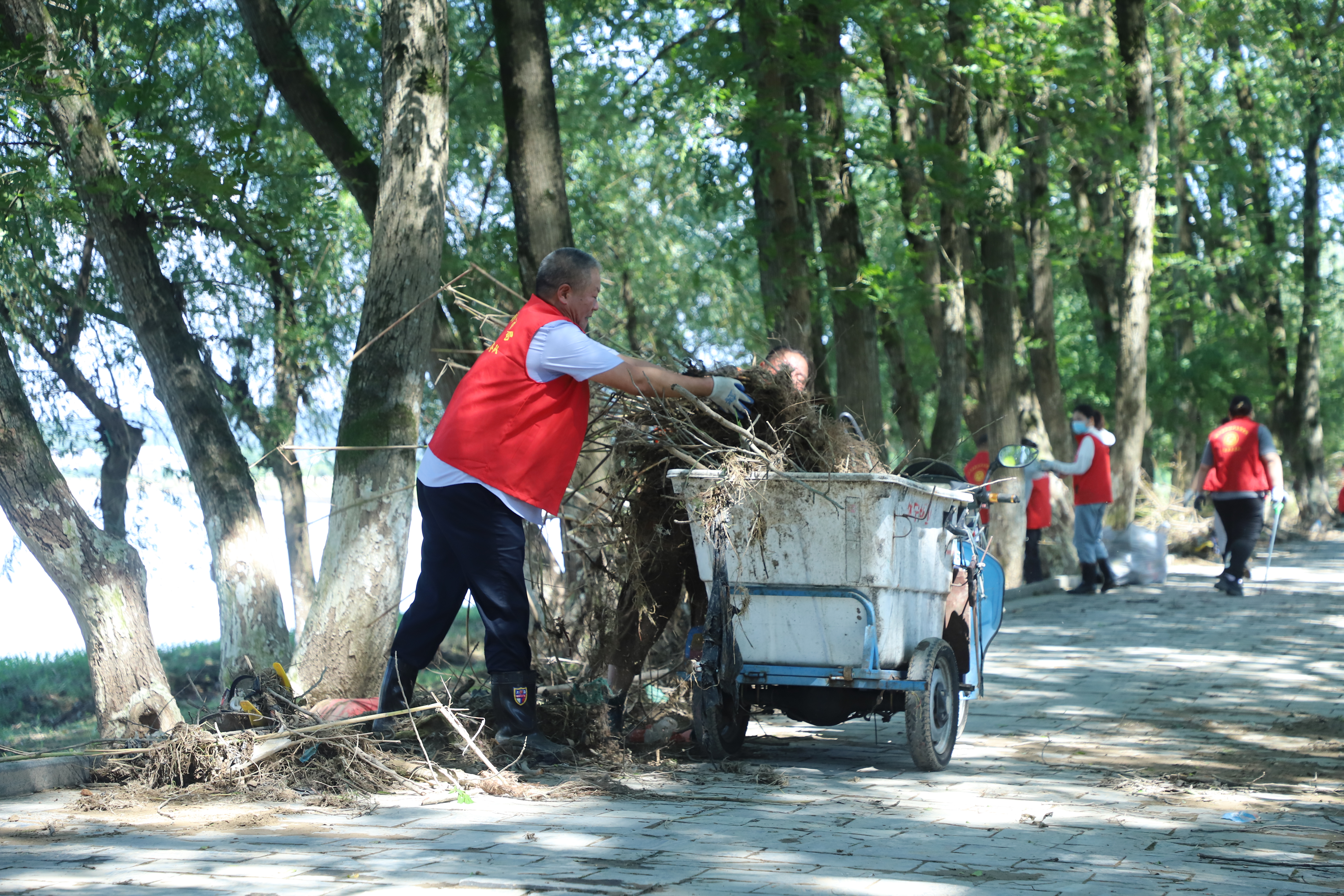 6月下旬,休宁县遭受强降雨影响,多处受淹。目前洪水退去,沿河两岸、道路两旁、栈道、公园及村庄等处披挂垃圾、沉积淤泥较多。在县中心城区横江公园万安坝至横江公园健身广场,横江钟塘桥至文昌桥段南岸河段等地,清淤工作正在紧张有序地进行中。大家身穿“红马甲”,手持扫把、铁锹、铁铲等工具清理淤泥,用高压水枪冲刷路面和栈道清洁河岸,以实际行动保护生态环境,努力再现河畅水清的美丽河道,共建美好家园。