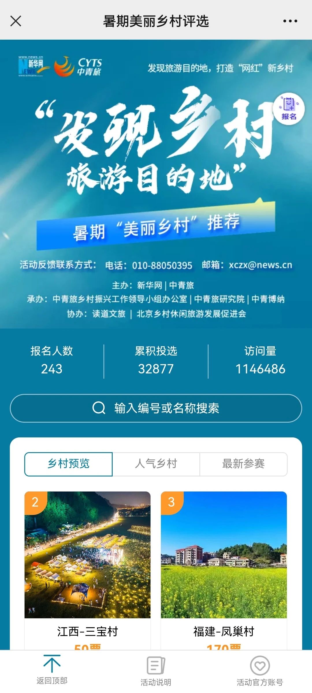 为提升乡村文旅品牌影响力,动员社会力量共同参与乡村振兴,新华网和中青旅共同发起了“发现乡村旅游目的地”全国评选,目前已进入暑期档投票阶段。
