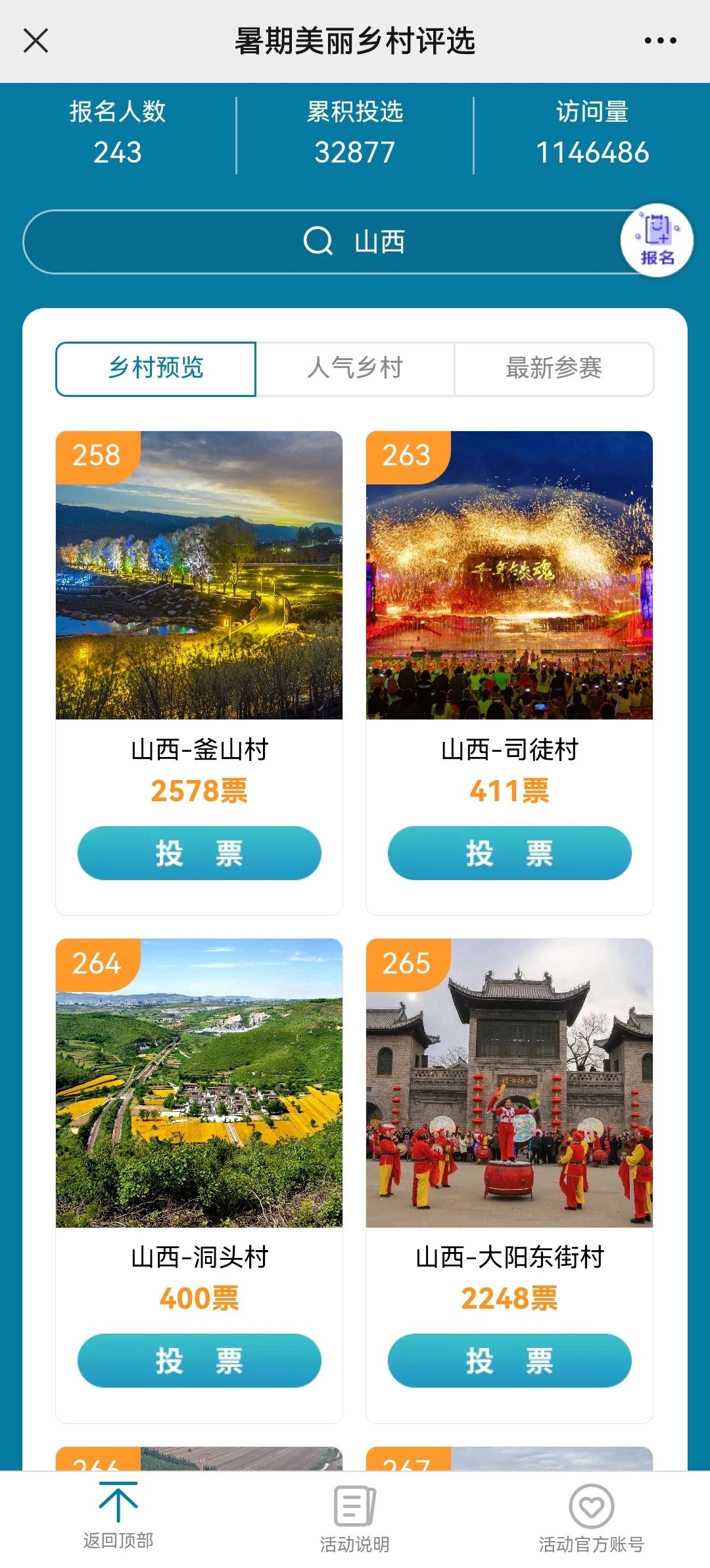活动期间,每个用户每天可投10票(每村可投1票)