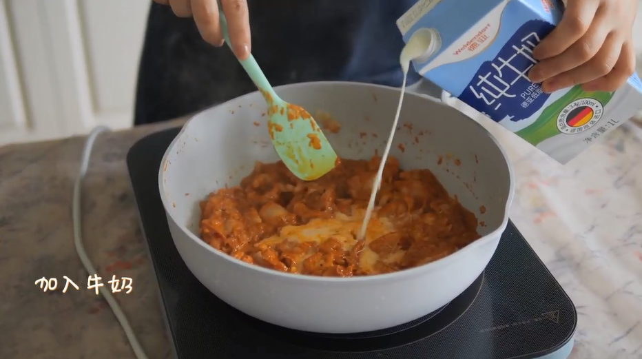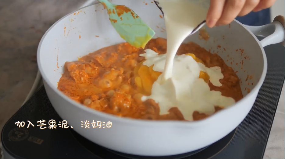 4.加入牛奶、芒果泥、淡奶油,少许盐、糖调味。