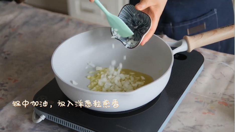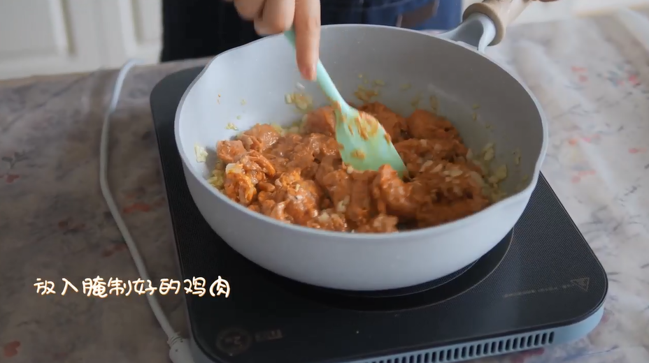 3.锅中加油,放入洋葱粒煎香,放入腌制好的鸡肉,翻拌均匀。