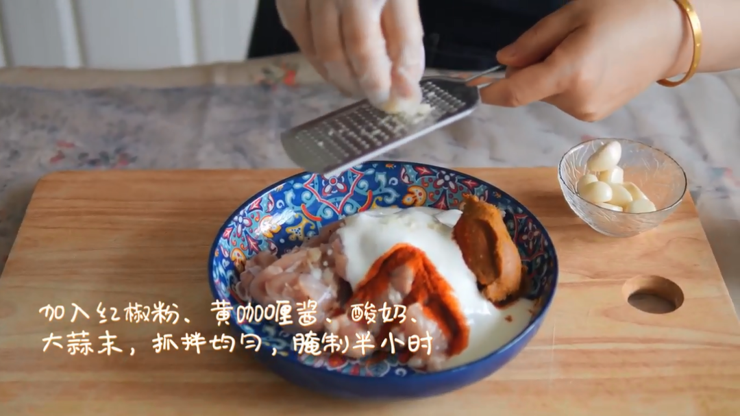 2.加入黑胡椒、红椒粉、黄咖喱酱西、酸奶、大蒜末,抓拌均匀,腌制半小时。