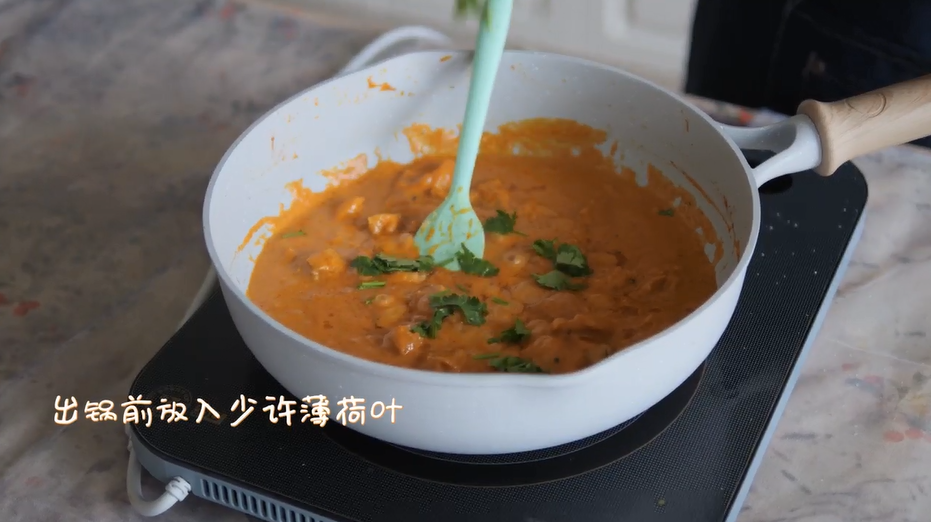 5.出锅前放入少许薄荷叶,出锅后加些淡奶油和薄荷点缀。