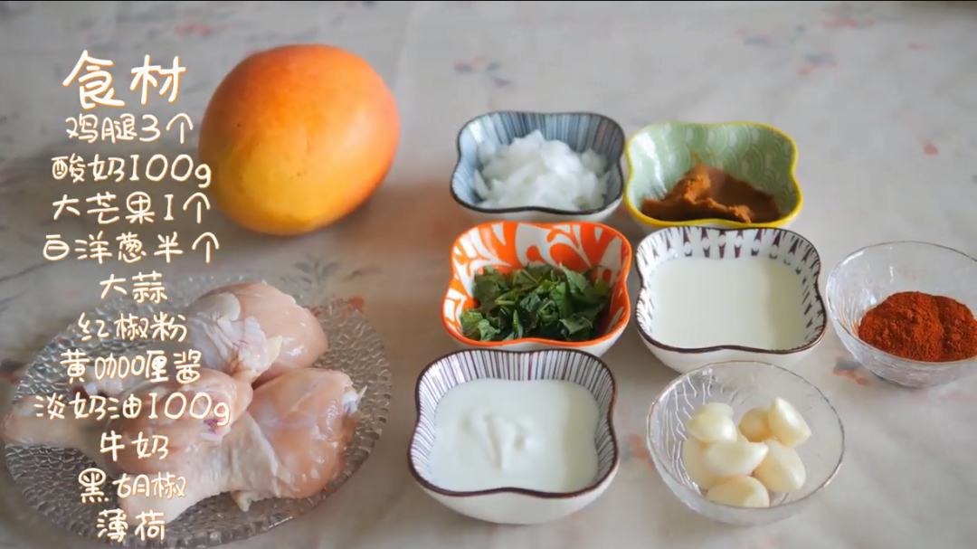 食材:鸡腿3个、酸奶100克、大芒果1个、白洋葱半个、大蒜、红椒粉、黄咖喱酱、淡奶油100克、牛奶、黑胡椒、薄荷、食用油、盐、白糖