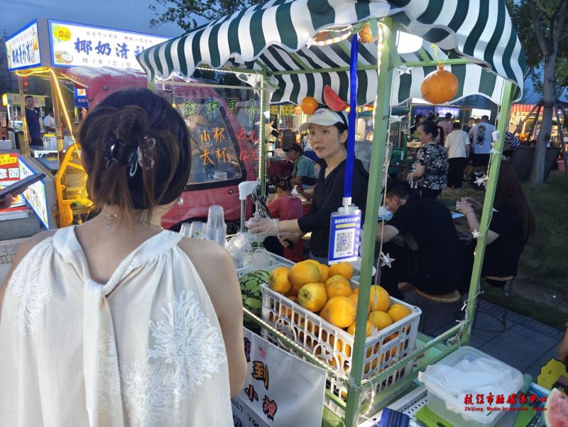 天气炎热,附近的居民会选择傍晚到三码头遛弯儿、散步、运动,现在又正是暑假期间,学生自然成为了人流量的“主力军”。淀粉肠、各类果汁、小糕点、烧烤、煎饼、儿童游乐设施……一波波散步纳凉的顾客驻足停留,选择自己中意的商品,手机扫码支付后,转场下一家。