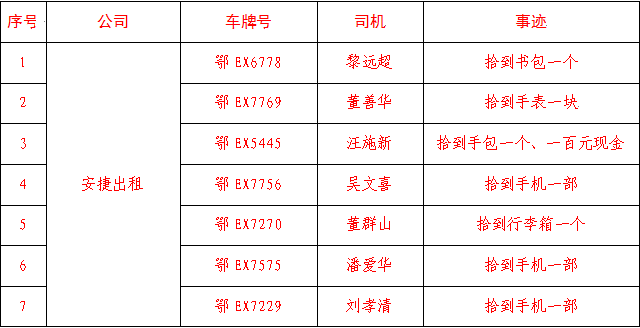 鄂EX5448驾驶员刘波(安捷出租):6月12日,刘师傅在车上拾得一个钱包,里面有多张银行卡、证件和少量现金,在与乘客取得联系,认真核对钱包内的物品信息后,刘师傅将钱包送还给失主。为刘师傅拾金不昧的精神点赞,特此表扬!