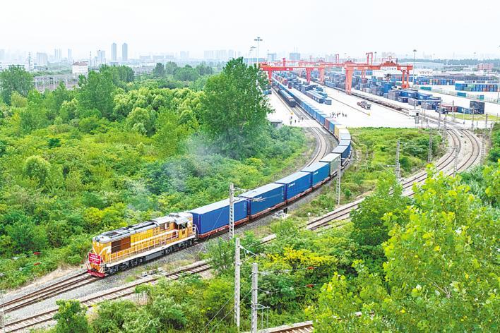 7月10日,在武汉市东西湖区中铁联集武汉中心站,X8017次中欧班列(武汉)满载轻纺服装、医用物资、电子产品等55个货柜货物正缓缓驶出,预计13天后抵达万里之外的德国杜伊斯堡。这趟列车是今年来全国累计开行的第1万列中欧班列,比去年提前19天破万列。(湖北日报全媒记者 倪娜 通讯员 张科 晏君 摄)