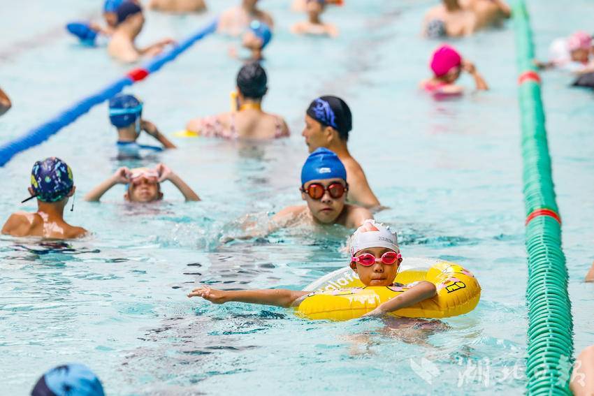 7月10日,在武汉市东西湖区五环体育中心游泳馆内,孩子们在泳池内游泳消暑。