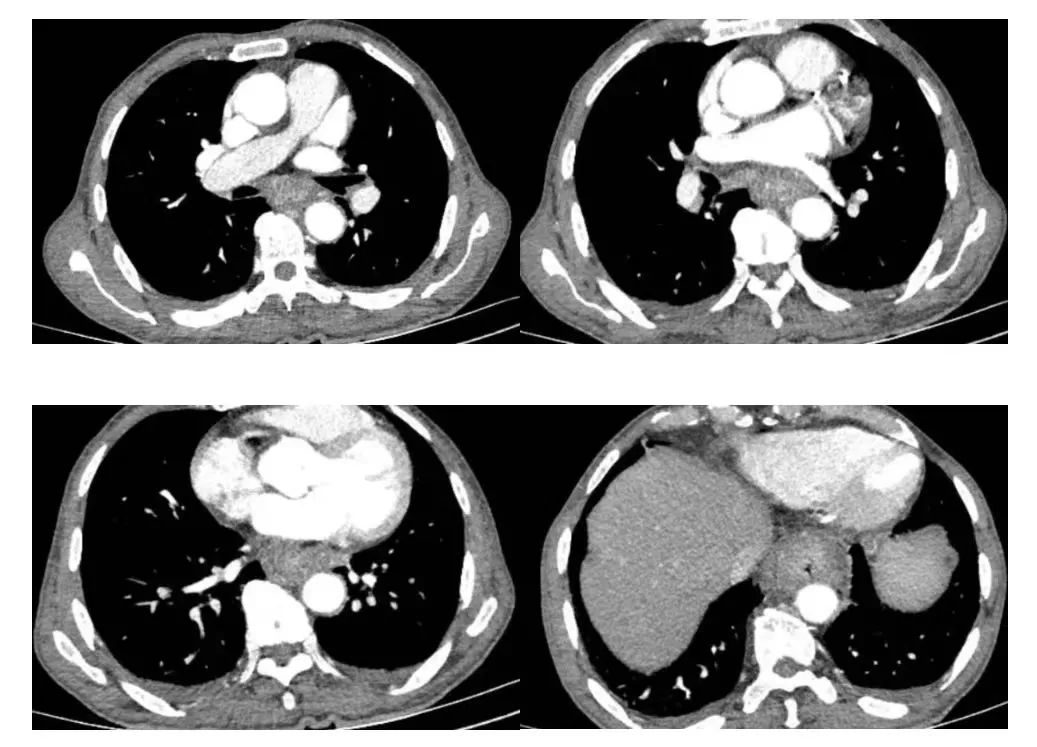 胸部增强CT:患者食管中下段管壁、贲门处胃壁明显增厚