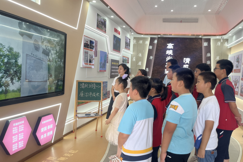 阳光驿站的志愿者们为学生播放平湖村自编自导的廉政视频,带领学生参观廉政展厅,学习“讲正气、树新风”“纠四风、治陋习”两大板块知识。参观结束后,以“如何做一个廉洁自律的好孩子” 为题鼓励学生展开讨论。孩子们将参观所学知识和生活实际联系起来积极发表自己的看法,活动气氛热烈。活动中志愿者利用廉政互动触摸一体机,让学生们将所学知识通过答题的形式巩固应用,并留下了电子照片与签名。