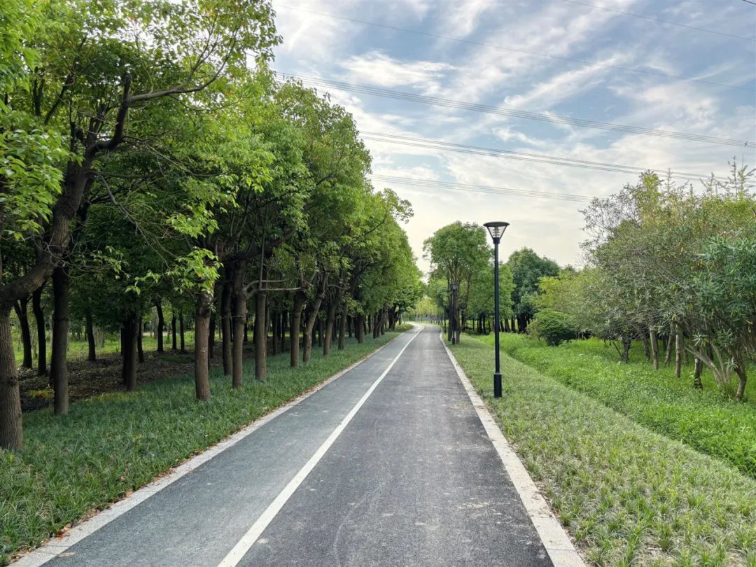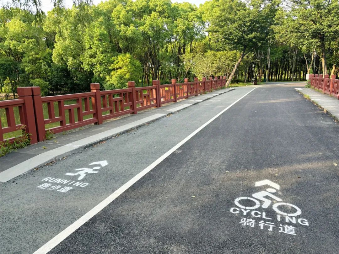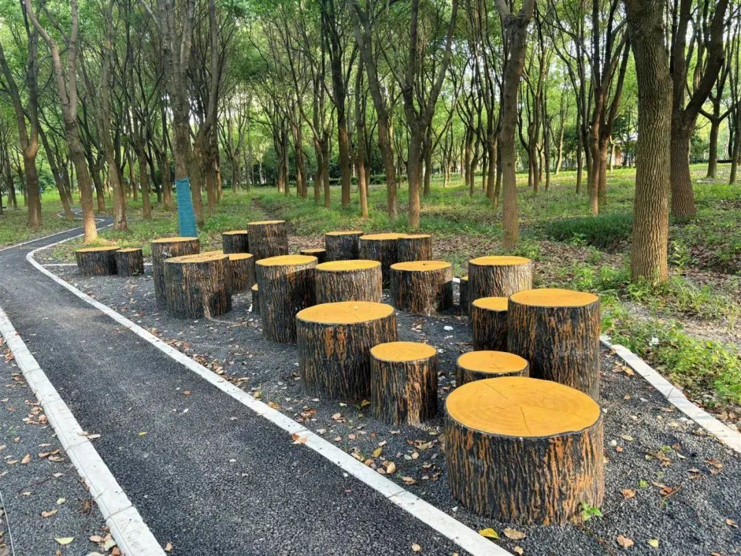 缓缓步入林地,成片的树木郁郁葱葱,阳光透过树叶,洒下斑驳的光影。一条崭新的健身步道贯穿其中,居民可以一边休闲散步,一边观赏美景,和大自然来个亲密拥抱。沿途还设置有供游客休息的小凳子,它们形似树桩,与周围的自然环境融为一体。