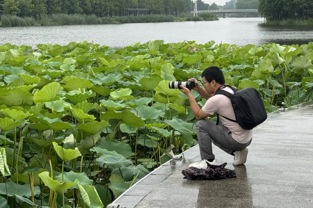 “今天公司正好放假,作为摄影爱好者当然要来拍细雨中的荷花。晴天的光影确实很棒,但雨中的荷花带着露水,最漂亮。”家住附近的市民智先生特意带上相机出门“扫荷”。