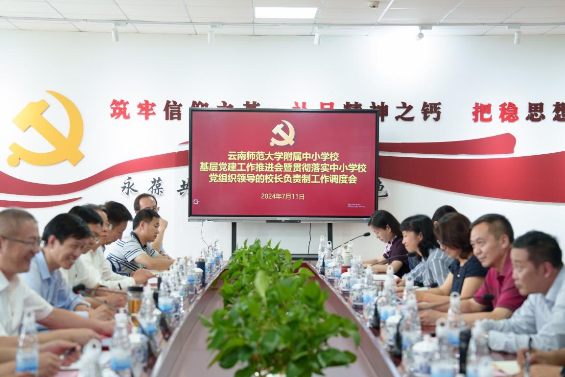 7月11日下午,附属中小学校基层党建工作推进会暨贯彻落实中小学校党组织领导的校长负责制工作调度会在云南师范大学实验中学盘龙校区举行。校党委书记张祖武,党委副书记、校长胡金明,党委副书记李宏、降富楼,纪委书记孙剑和相关职能部门主要负责人,基础教育集团,附属中学、实验中学、附属小学、云南民族中学、附属世纪金源学校党政领导参加会议。