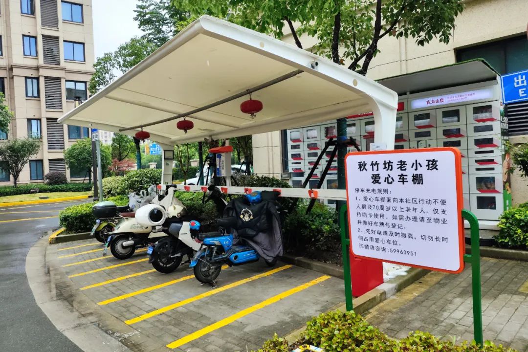 “入库坡道太陡了,我们老年人一不小心就要摔跤。”“充电桩要扫码才能用,我不知道怎么弄。”为了解决特殊群体电动自行车停放的实际困难,秋竹坊居委会筹建组联合物业重新规划,从破解痛点问题出发,将地面一处非机动车停车点打造为爱心车棚,供小区行动不便人群及70周岁以上老年人使用。