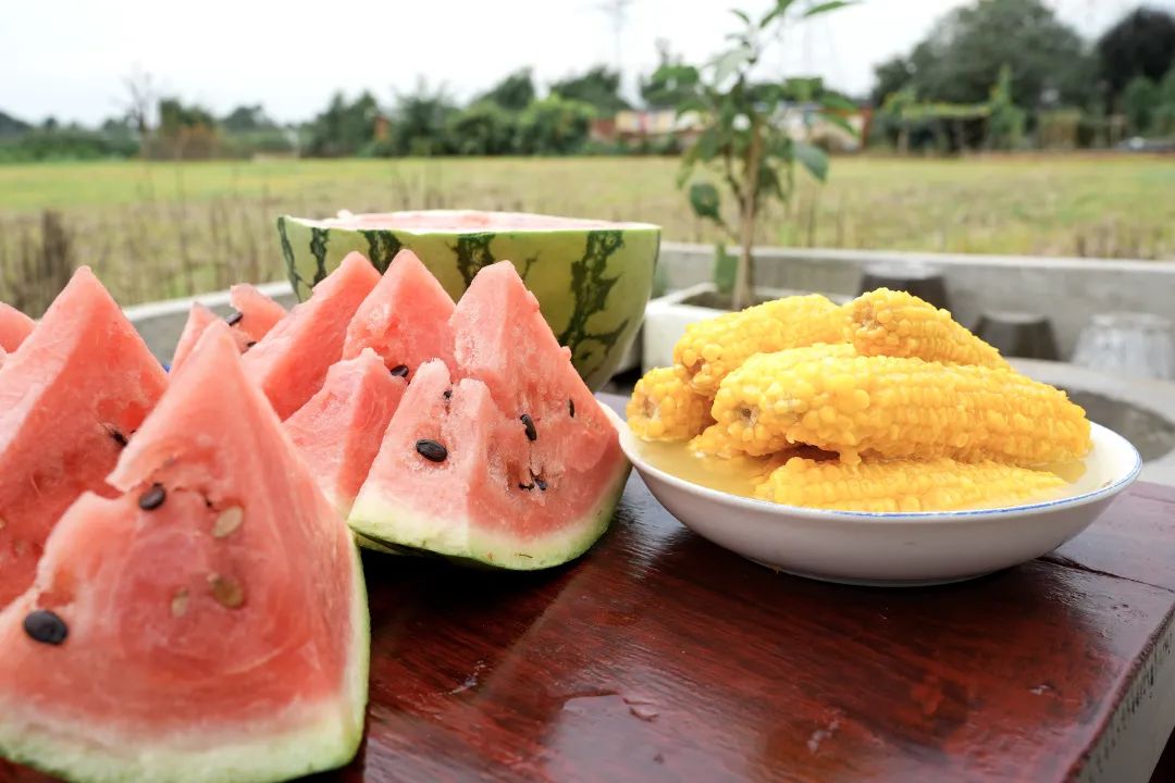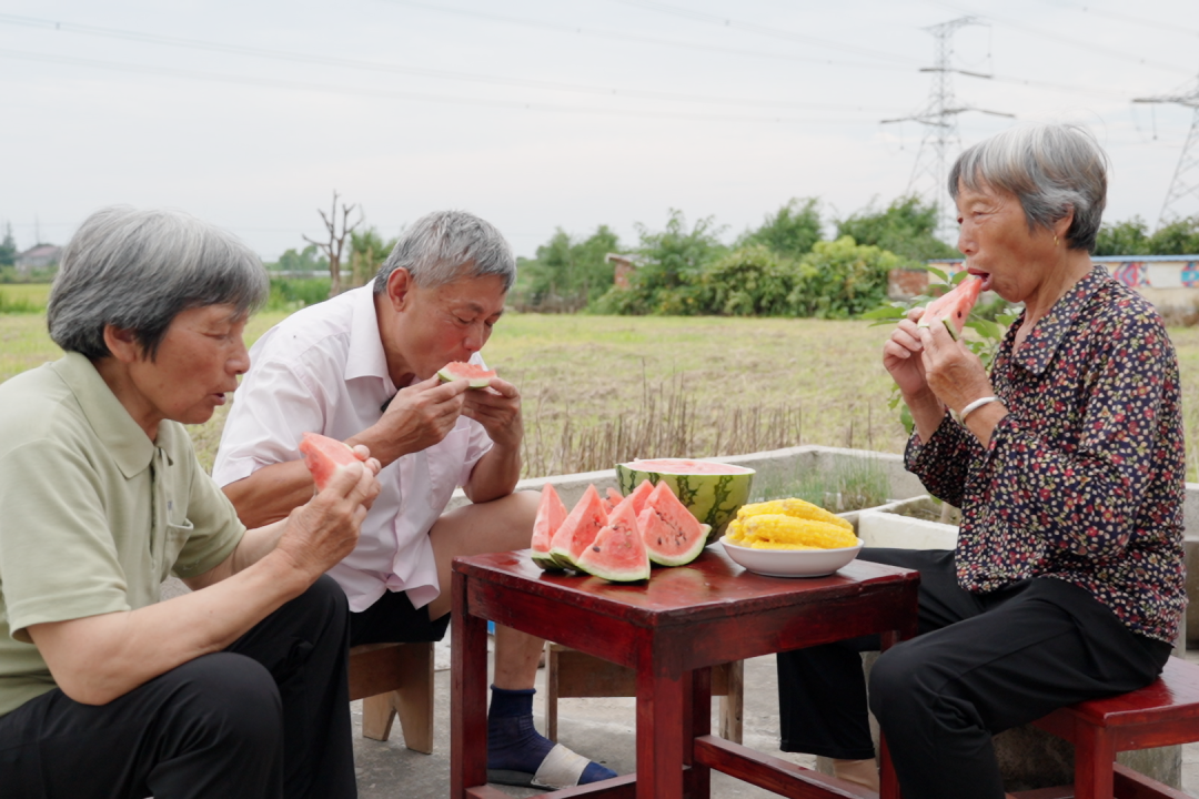 等玉米放凉的空隙,陈玉书将西瓜从井中捞出放在小方桌上,一刀下去,脆声崩开,露出鲜红的瓜瓤,满是夏天的清新。冰过的西瓜切成三角块,咬一口,吃下的是沁人心脾的凉爽,身上的每个毛孔似乎都舒张开来,暑气顿消。“这个西瓜灵的,沙沙甜甜、冰冰凉凉,我要多吃两块。”村民程秀珍边吃边说。
