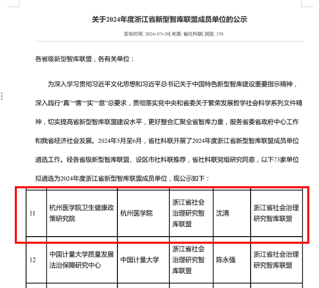 近日,浙江省社科联公布最新浙江省新型智库联盟成员单位遴选结果,经过层层筛选与严格评估,我校卫生健康政策研究院入选浙江省社会治理研究智库联盟成员单位。