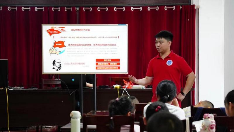 7月12日,是池州学院艺术与教育学院“主打曲”实践团赴六安市舒城县晓天镇双河村展开红色文化支教活动的第二天。上午9时,队长张翔,携手王旗辉、王敏琴、丁传海、胡梦园四名队员于双河村委员会一楼会议室开展红色教育课程。