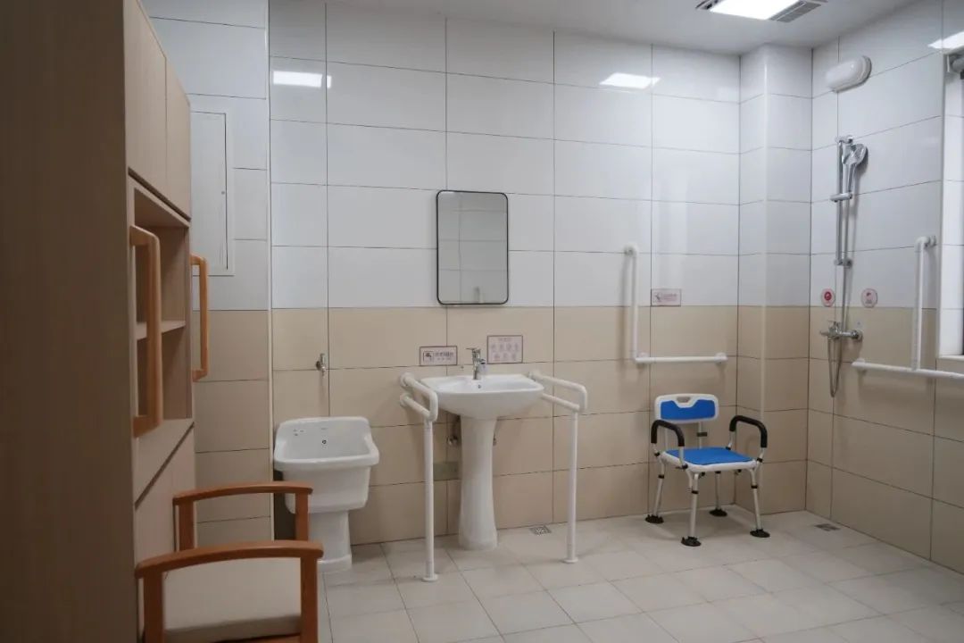 华庄村长者照护之家属于村居嵌入式养老机构,整体风格温馨舒适,房间涂色和墙布均采用暖色调,奶白色的墙体上安装有扶手和防撞条,宽敞的助浴室做了全套防滑处理,无障碍适老化设计随处可见,细节感满分。