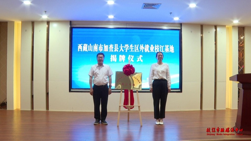 活动中,枝江市委常委、市委宣传部部长、市总工会主席高菁与加查县委常委、副县长陈爱国共同为西藏山南市加查县大学毕业生区外就业枝江基地揭牌。