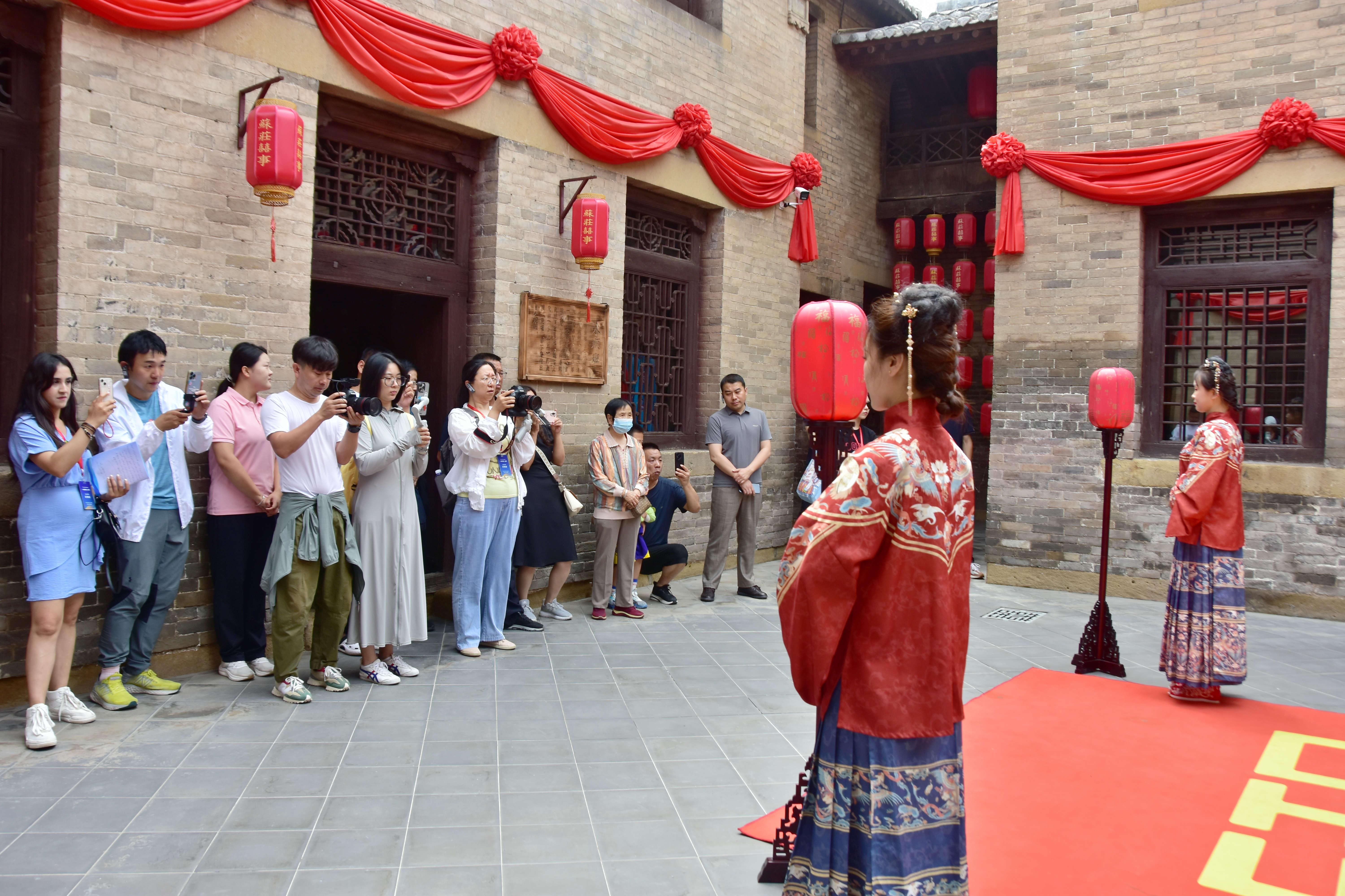 在喜镇苏庄,媒体记者们走进一座座清代院落,近距离体会细腻入微的迎亲嫁女表演,系统了解婚俗文化这一中国古老传统。河西镇苏庄村有着“喜文化”的“根”,依靠当地连理树的传说和传统建筑,苏庄村大力发展“喜文化”,积极探索传统文化创造性转化的路径,打造出“传统村落+文化创意”和“传统村落+艺术创作”等多元经济业态。