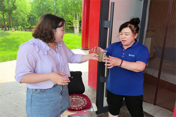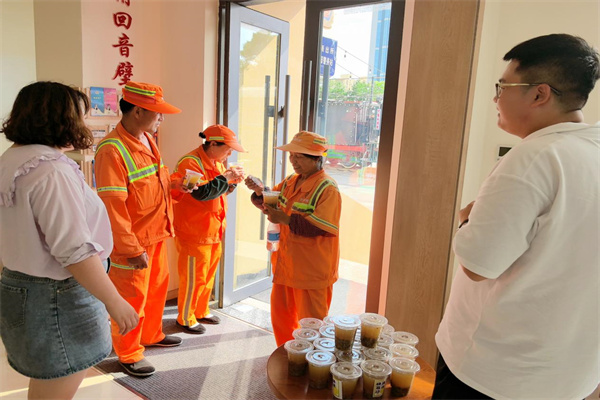 网格员向正在工作的户外劳动者送上亲手熬制的绿豆汤,并叮嘱他们在要做好自我保护,注意防暑降温和自身健康。户外劳动者纷纷表示:谢谢社区对我们的关爱,让我们在高温工作中感受到了清凉,我们在工作中也会注意防暑降温。