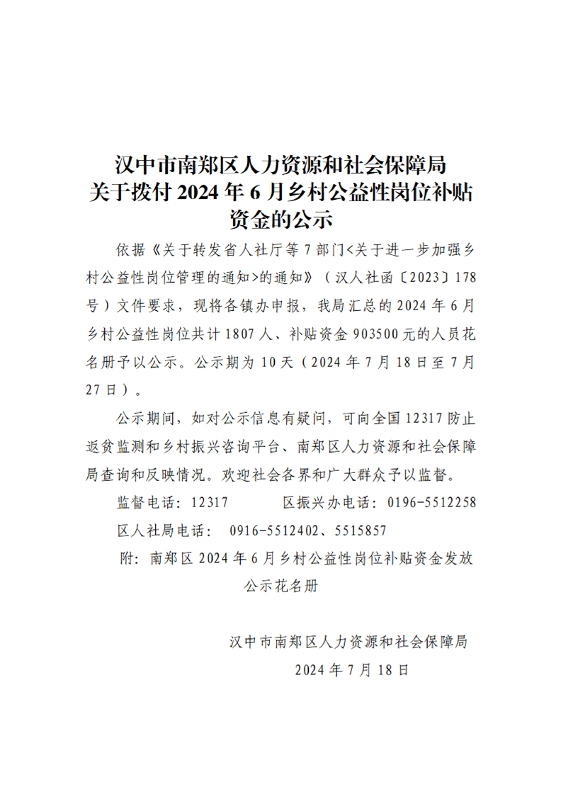 汉中市南郑区人力资源和社会保障局关于拨付2024年6月乡村公益性岗位补贴资金的公示