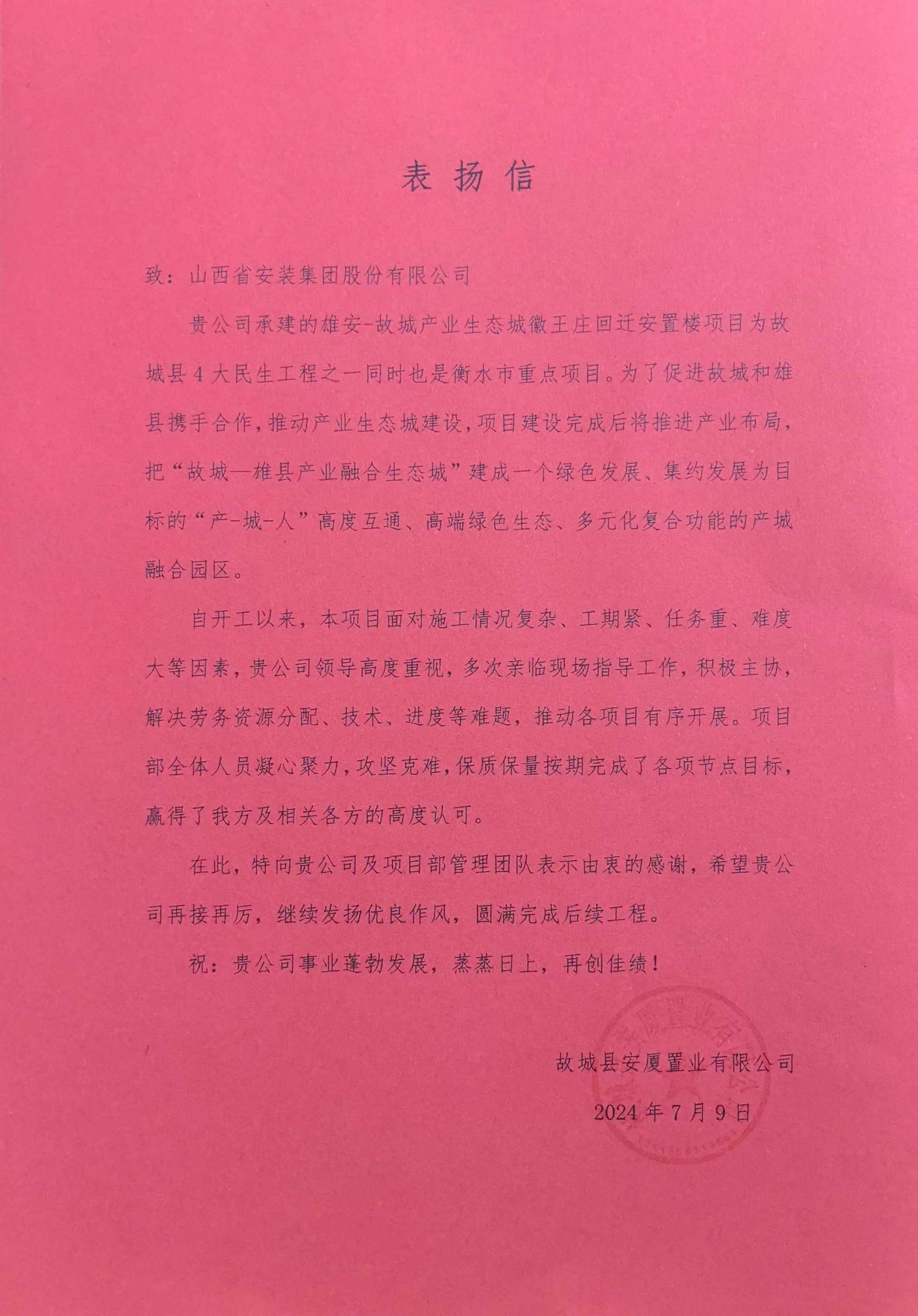 7月9日,故城县安厦置业有限公司向集团致表扬信,对集团华中工程公司在雄安—故城产业生态城徽王庄回迁安置楼工程项目建设当中所展现出的高水平施工作业与高效化管理能力表示高度赞扬。