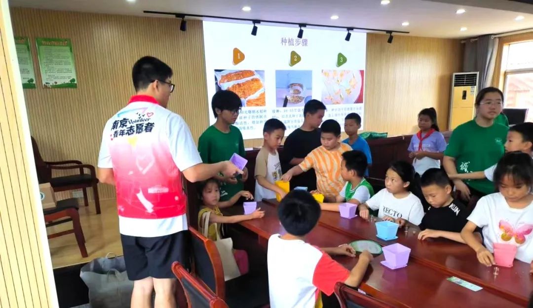 活动中,南京农业大学志愿者通过图文讲解的方式让孩子们了解水稻的种植知识和技术。同时,志愿者和孩子们一起播种、铲土、种植、施肥、浇水,通过现场实践活动让孩子们加深印象。
