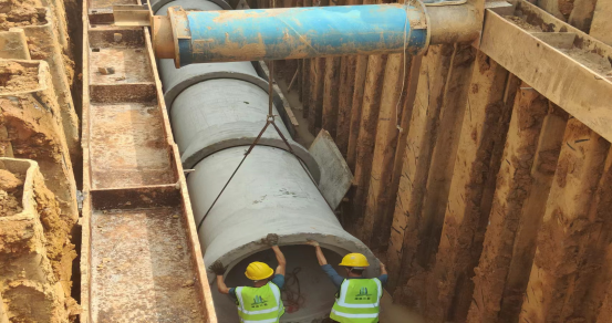 7月18日,东兴大道片区雨污分流改造工程项目现场,施工人员正在有序安装管道、挖机正在开挖管道……呈现出一派热火朝天的施工景象。