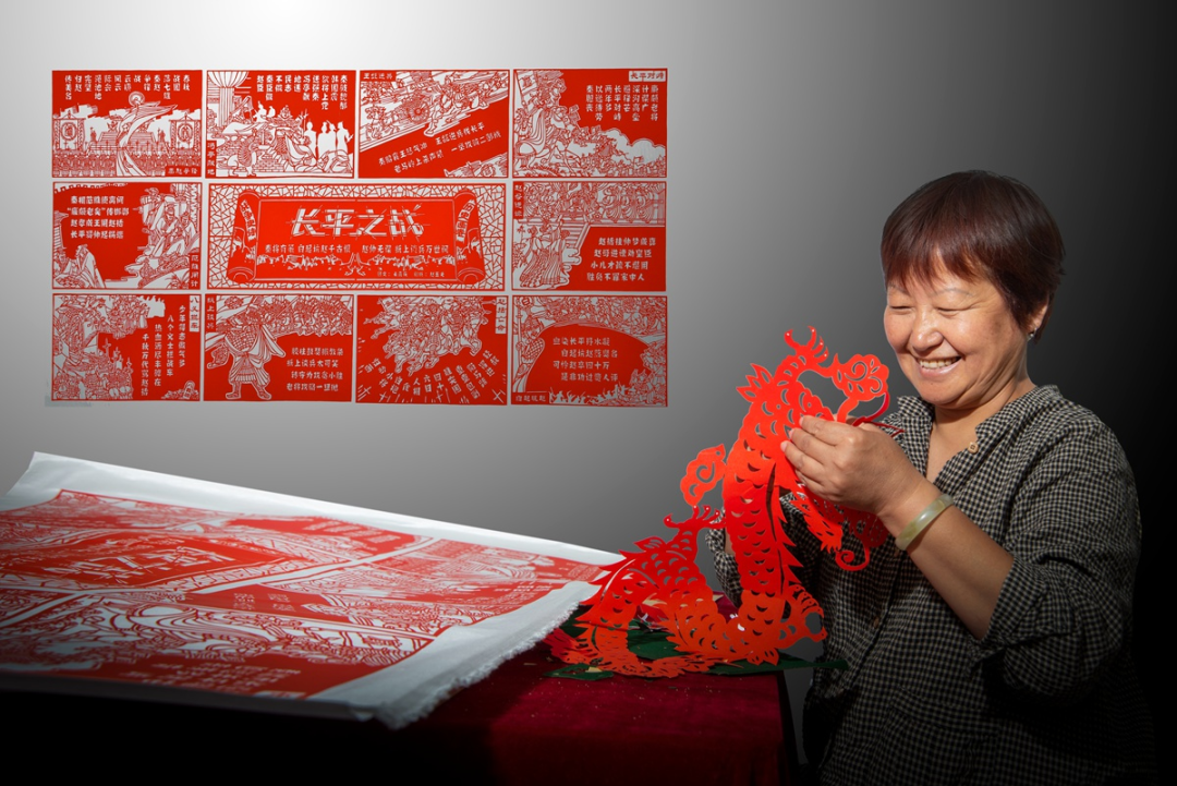 山西省级非物质文化遗产项目代表性传承人赵玉先展示剪纸。郭国伟摄