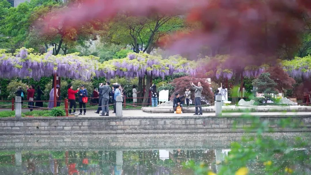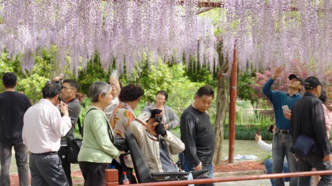 在紫藤园里,老人们悠闲地漫步,