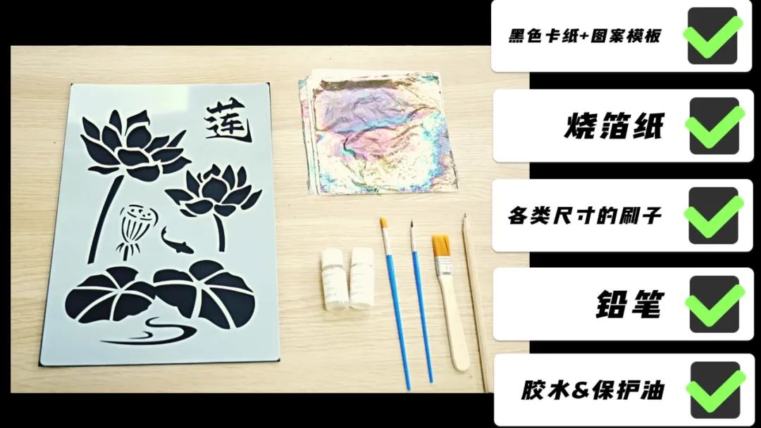 烧箔纸、黑色卡纸、图案模板、铅笔、各类尺寸的刷子、胶水、保护油