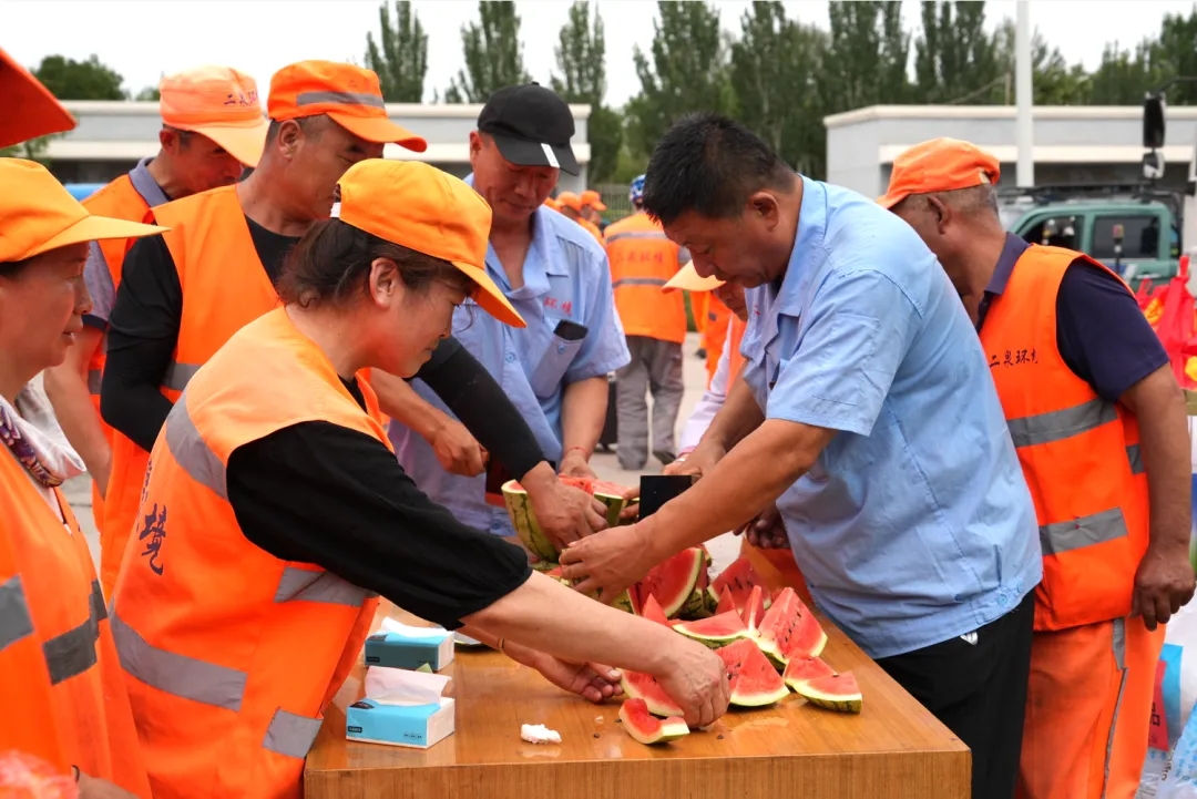 活动现场,工作人员提前将准备好的西瓜、绿豆、冰糖、茶叶、饮料等防暑降温“爱心礼包”摆放好,并现场为环卫职工们切好西瓜,邀请大家共同品尝。沉甸甸的“爱心礼包”,甜滋滋的美味西瓜,让在场的职工流露出喜悦的笑容。
