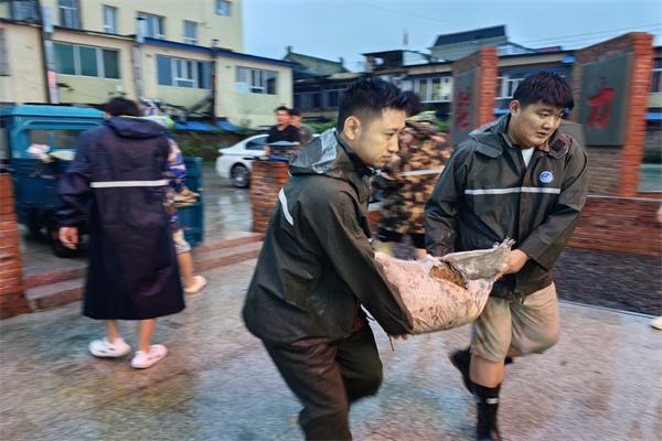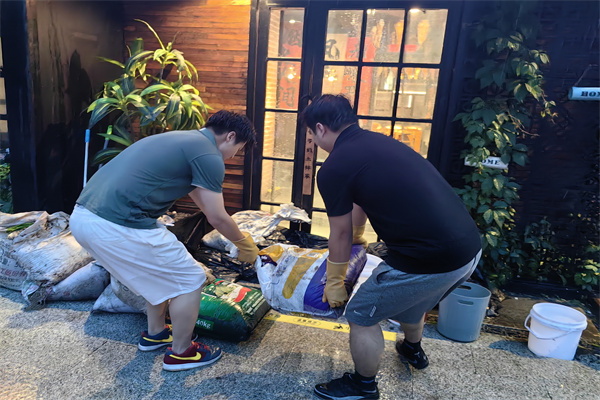 发现水情后,社区工作人员迅速启动应急响应机制,调动防汛沙袋等物资对店门口处进行加固,提高防水门槛,防止积水倒灌,全力保障辖区内居民的生命财产安全。