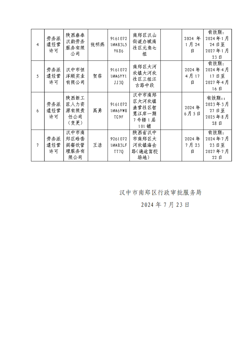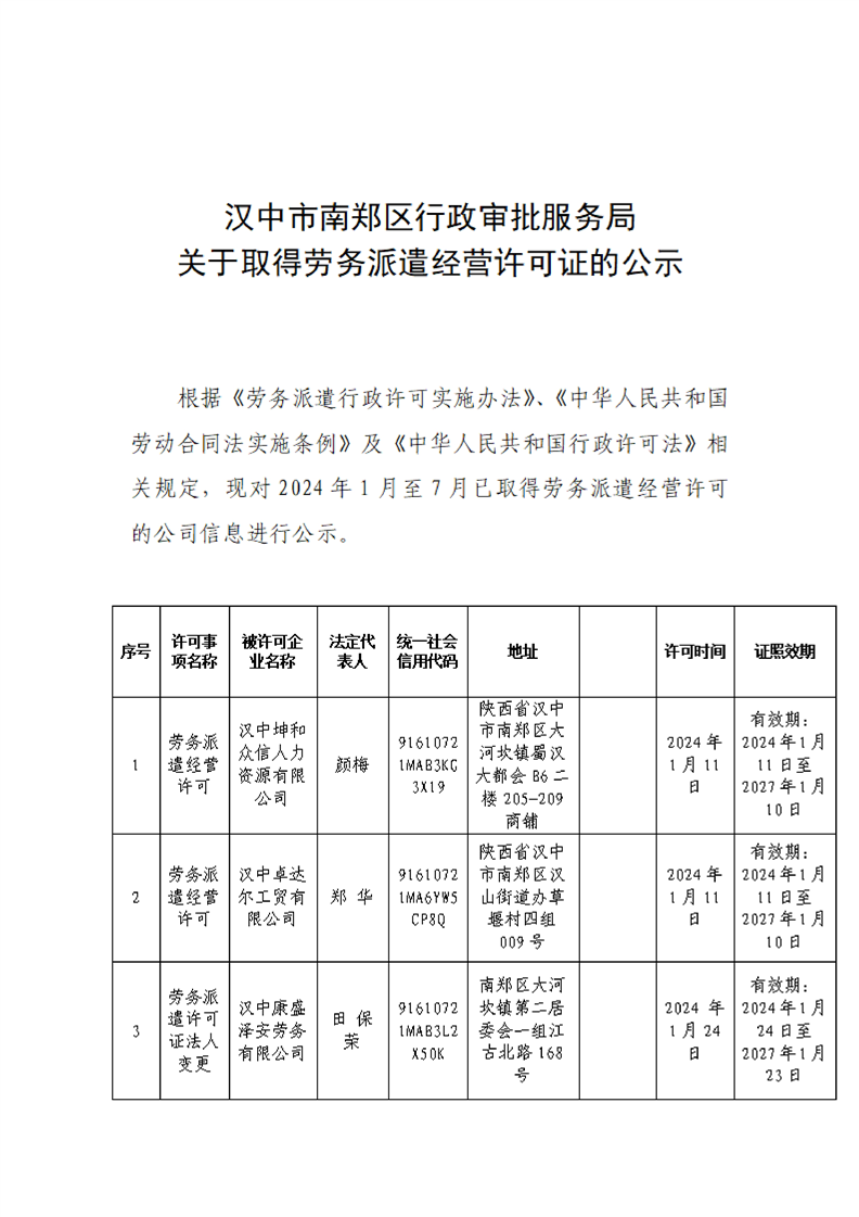 汉中市南郑区行政审批服务局关于取得劳务派遣经营许可证的公示