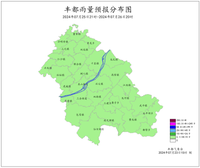2024年7月22日16时至7月23日16时我县多云到晴。峰子山出现7级大风,极大风速16.7米/秒(武平峰子山,23日05时),最低气温16.0~36.0℃,最高气温24.5~42.8℃。丰都国家基本站最低气温29.3℃,最高气温38.7℃。