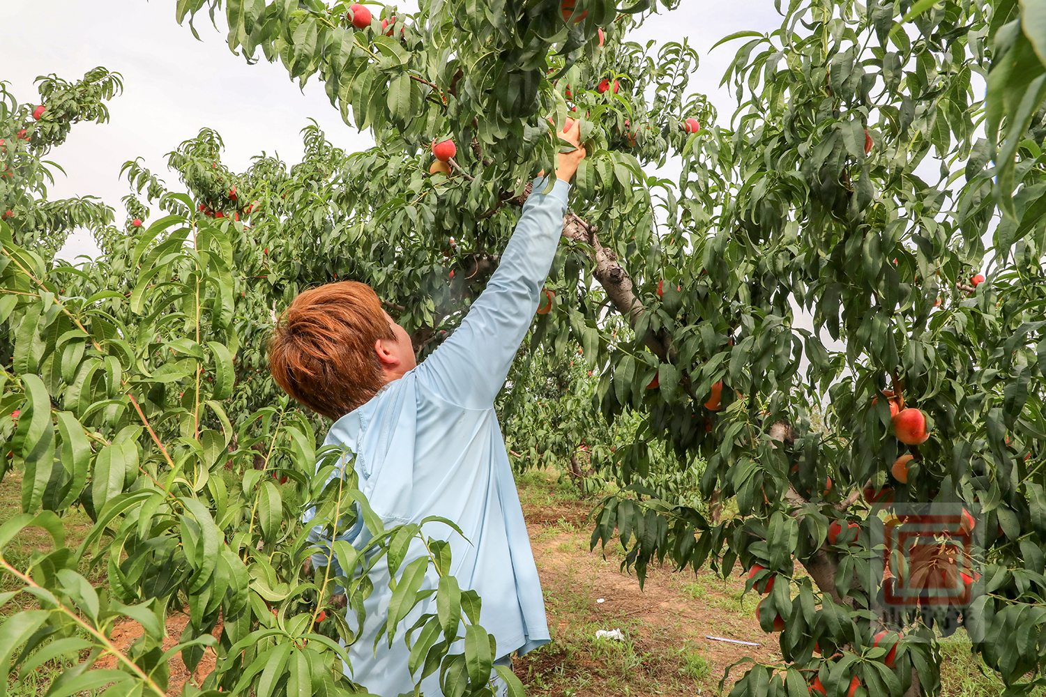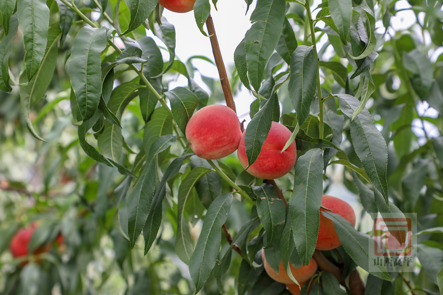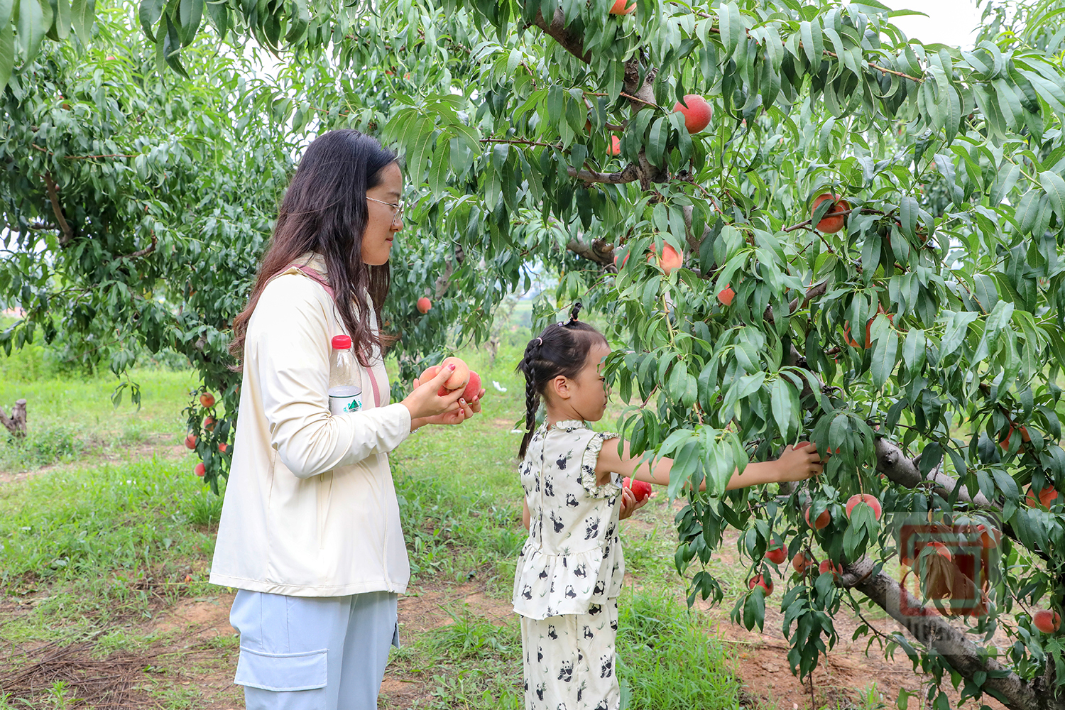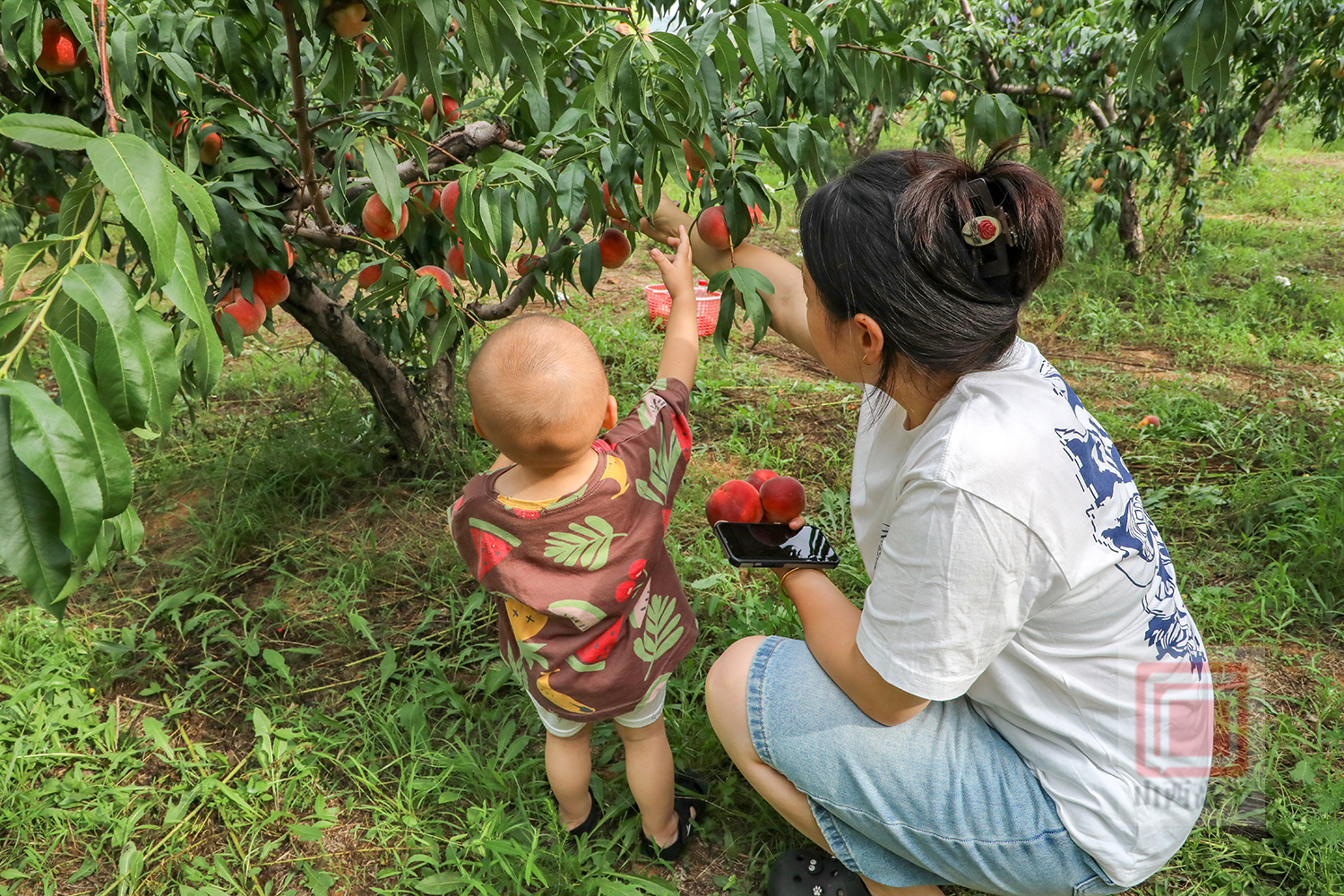 走进采摘园,果香四溢。白里透红、个大饱满的水蜜桃挨挨挤挤,压弯了枝头,在绿叶的衬托下显得格外诱人。游客们穿梭于桃树之间,尽享田园采摘乐趣。