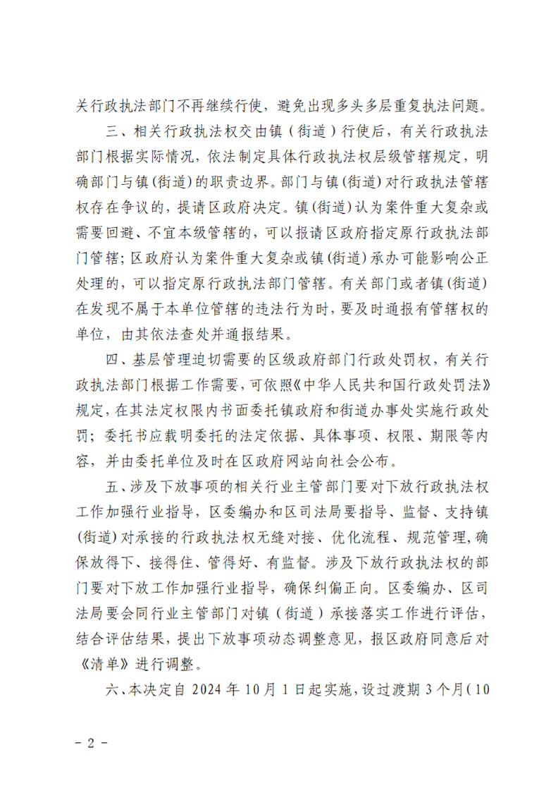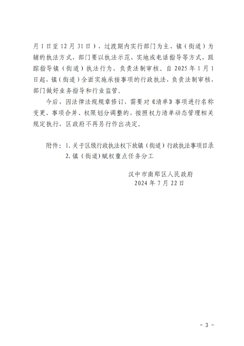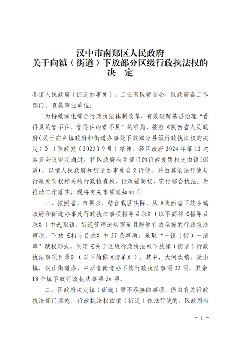 汉中市南郑区人民政府关于向镇(街道)下放部分区级行政执法权的决定