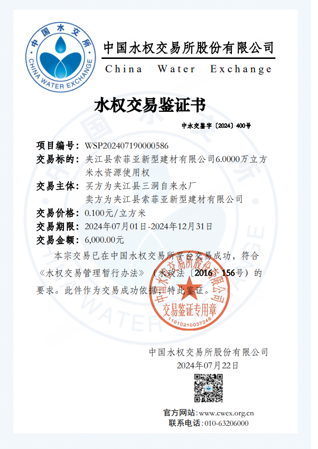 今年以来,夹江县积极落实水权制度、推行水权交易、培育水权交易市场,充分发挥市场配置水资源的作用,7月22日,夹江县在中国水权交易所顺利完成1例水权交易,此次交易转让方夹江县索菲亚新型建材有限公司通过加强水资源管理和利用,进而实现水资源利益最大化,而夹江县三洞自来水厂因供区用水量增大,及需用水补给,最终在国家水权交易平台完成交易。此次水权交易水量为6万立方米,交易价格每立方米0.1元。