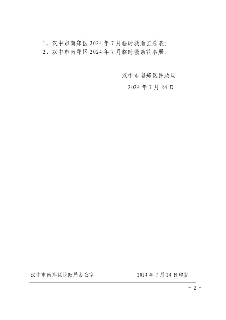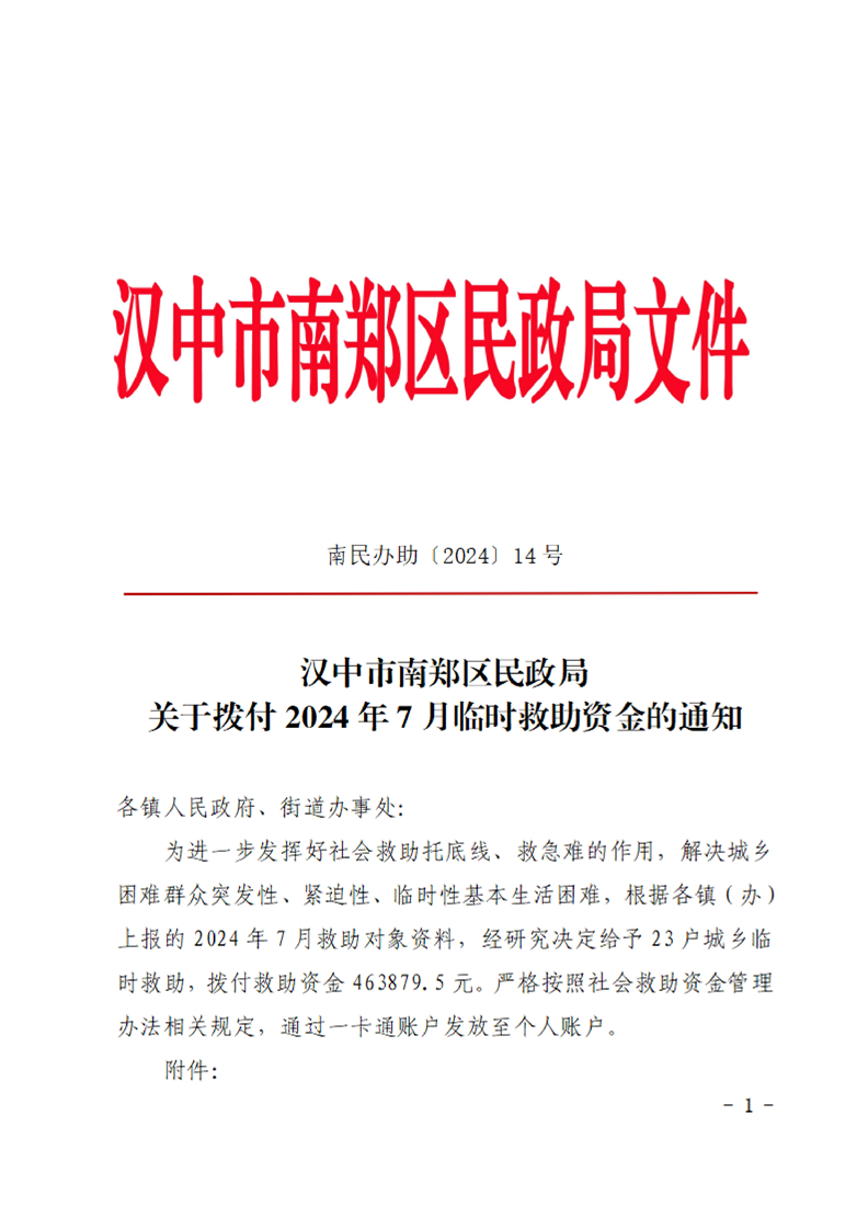汉中市南郑区民政局关于拨付2024年7月临时救助资金的通知